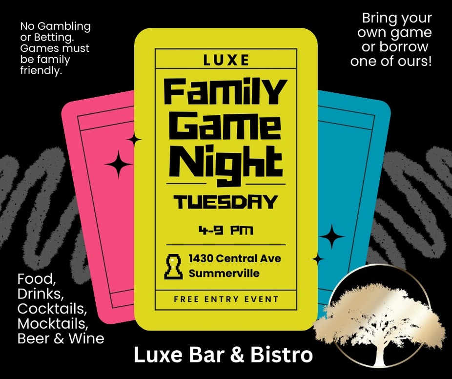 Every Tuesday is FAMILY GAME NIGHT at Luxe. Bring your own game or borrow one of ours. All ages welcome. As always, gambling or betting is prohibited and all games need to be family friendly. Grab a friend and come have some game time fun. Hungry too? Enjoy one of our amazing appetizers, salads, flatbreads or sandwiches. Menu includes a large selection of gluten free options as well. Check out our online menu!